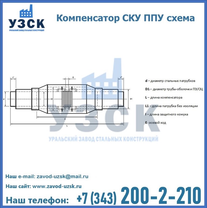 Уральский Завод Стальных Конструкций в Экибастузе предлагает готовые изделия, а также вы можете приобрести компенсатор СКУ ППУ под заказ. Наш завод располагает всем необходимым оборудованием для производства нестандартных позиций компенсатора СКУ в ППУ изоляции. Завод «УЗСК» предлагает большой выбор качественных и надежных компенсаторов СКУ ППУ, полностью укомплектованных и готовых к эксплуатации. Мы гарантируем соответствие нашей продукции всем требованиям ГОСТ и ТУ, износостойкость и высокую производительность. Наше предприятие поставляет и производит оборудование, имеющее длительную гарантию и большой эксплуатационный ресурс. Если вы хотите заказать сильфонные компенсационные устройства СКУ ППУ или другое оборудование с доставкой, наши специалисты помогут рассчитать стоимость транспортных расходов и организуют доставку товара. Вы можете оформить заказ на продукцию на нашем сайте, для этого достаточно заполнить форму обратной связи.